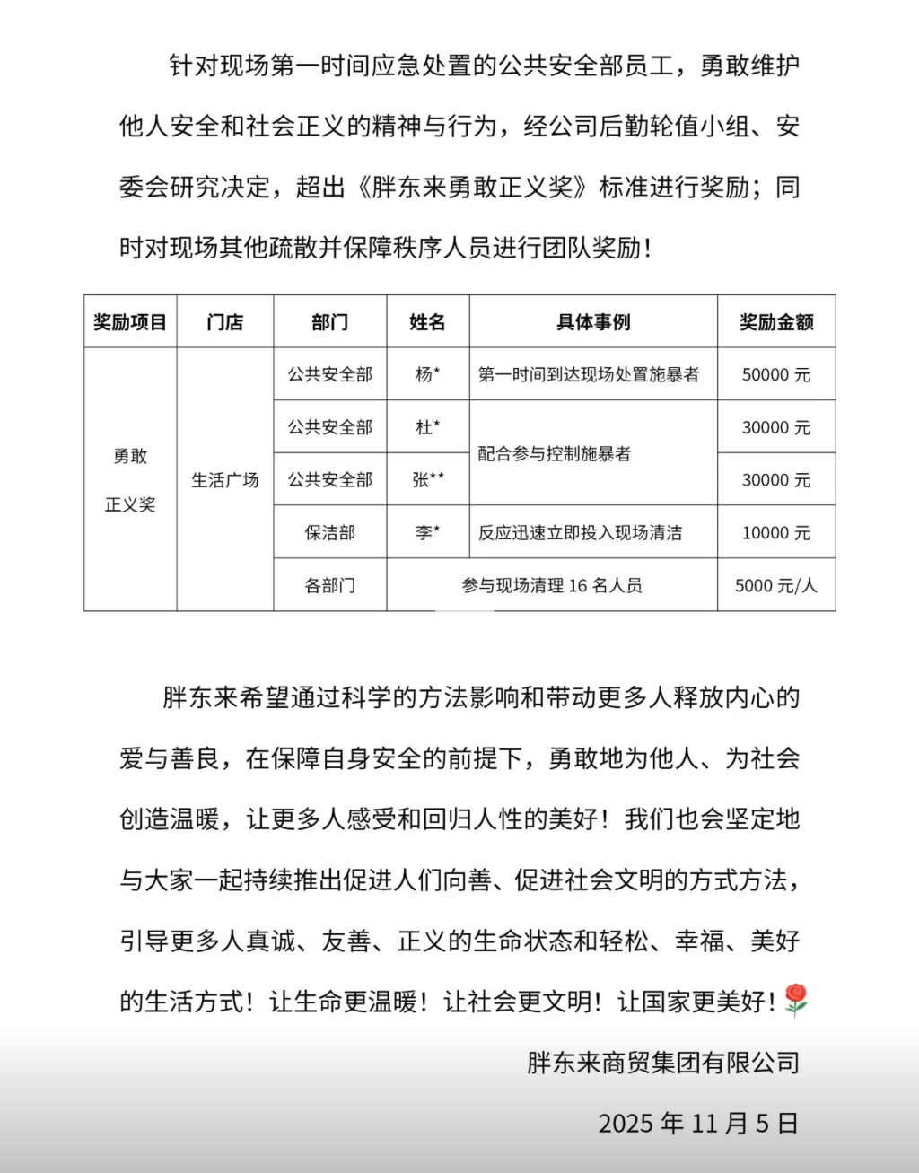 正文 胖东来公示奖励在伤人事件中参与应急处置的20名员工,最高5万元 海信证券 V管理员 /2025-11-06 06:50:04/5阅读/0评论 1106 11月5日晚,河南许昌胖东来超市有限公司官方抖音账号发布关于胖东来员工勇敢正义奖励公示,据公示信息,公司对于参与11月2日生活广场突发故意伤害事件应急处置的员工进行奖励,给予20名员工共计20万元奖励,其中给予第一时间到达现场处置施暴者的公共安全部员工杨某5万元奖励,配合参与控制施暴者的两人3万元奖励,反应迅速立即投入现场清洁的一人1万元奖励,此外,参与现场清理的16名人员每人奖励5千元。