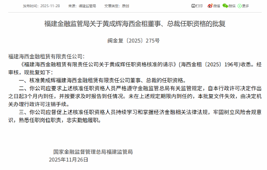 正文 海西金租董事长、总裁任职资格获批 海信证券 V管理员 /2025-11-28 18:05:03/1阅读/0评论 1128 11月28日金融一线消息,福建金融监管局发布批复,核准潘青松福建海西金融租赁有限责任公司董事长的任职资格,核准黄成辉福建海西金融租赁有限责任公司董事、总裁的任职资格。